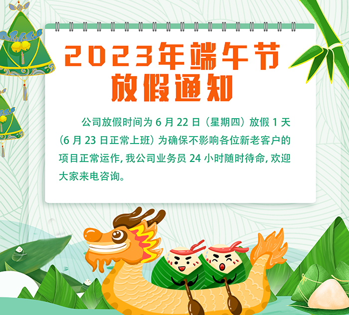 中國(guó)的傳統(tǒng)佳節(jié)端午節(jié)即將來(lái)臨,在此感謝新老客戶對(duì)我公司的信任和支持;根據(jù)法定節(jié)假日規(guī)定,結(jié)合本公司實(shí)際情況,經(jīng)公司領(lǐng)導(dǎo)決定,現(xiàn)將2022年端午節(jié)放假安排通知如下: