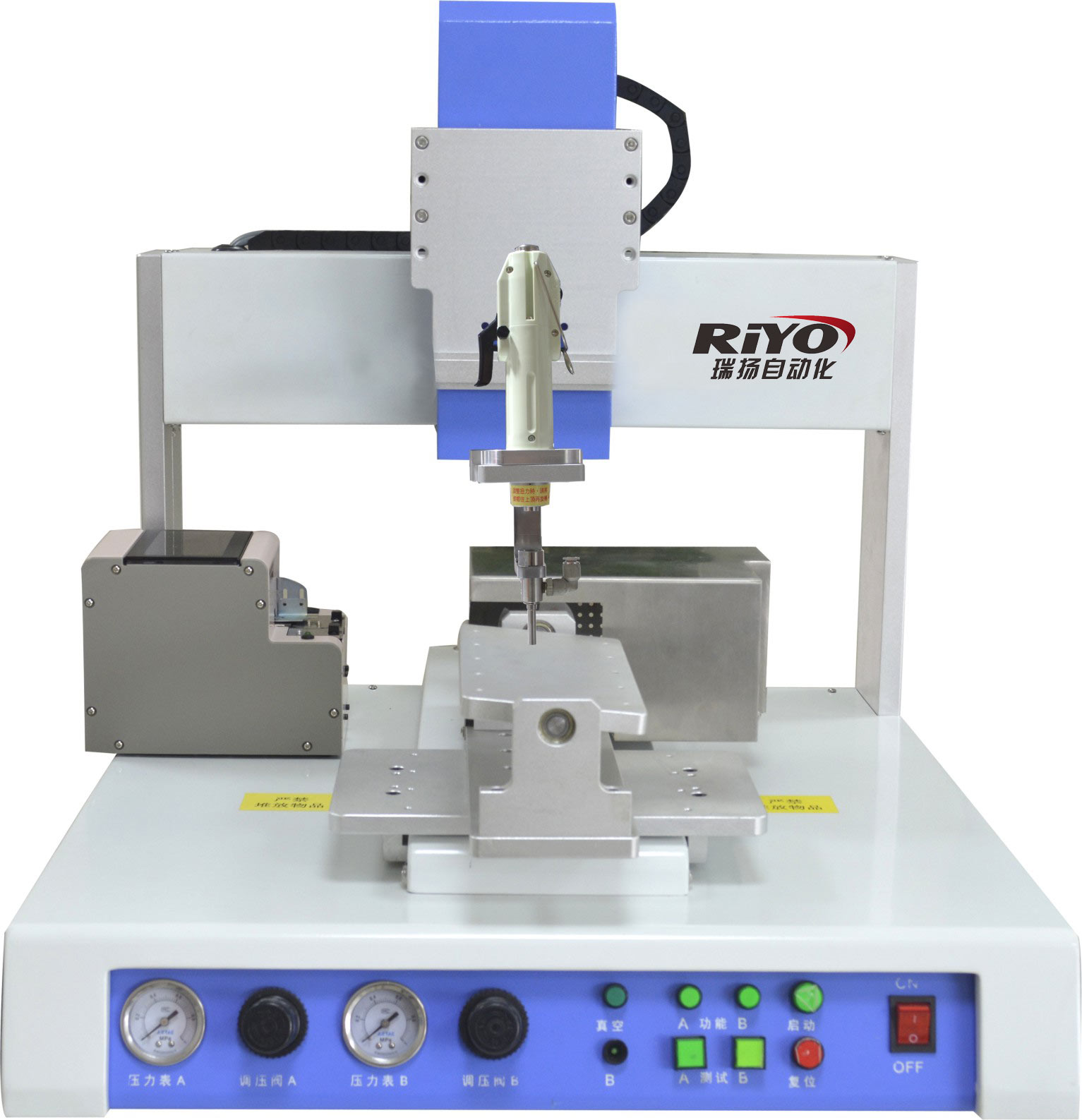 1、吹氣式自動螺絲機是由自動螺絲機系統(tǒng)(即螺絲供料機)與全自動機械手組合而成,就是螺釘通過壓縮空氣吹到夾嘴中,電批下降將其鎖入產(chǎn)品。其中鎖付路徑由機械手編程控制,螺絲供料系統(tǒng)配合工作,另加螺絲滑牙、浮鎖、漏鎖等檢測;整套設(shè)備全自動配合完成,這種模式的自動螺絲機優(yōu)點就是靈活穩(wěn)定,效率高。據(jù)設(shè)定好的坐標(biāo),機器自動完成產(chǎn)品鎖付。Z軸可配2支或4支電批同時鎖付,生產(chǎn)效率極高。
